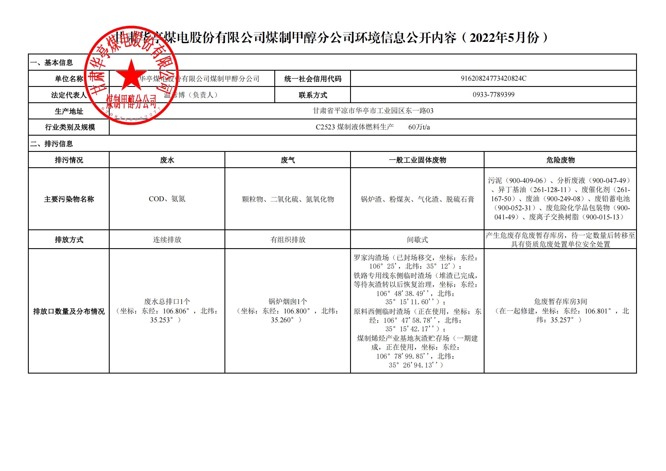 煤制甲醇分公司環(huán)境信息公開內(nèi)容(2022年5月)